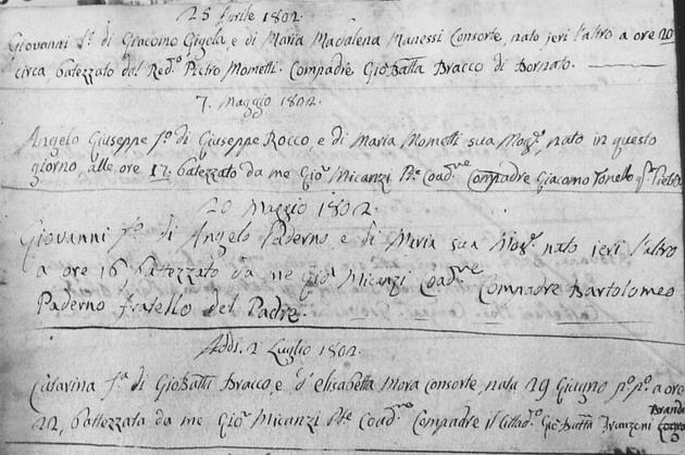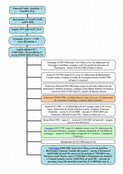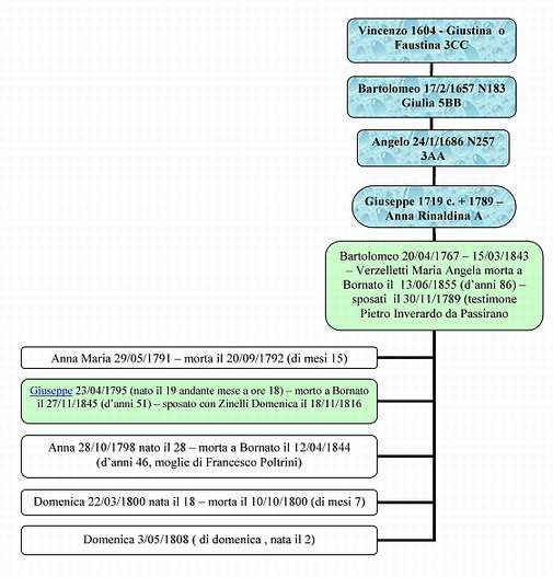 Con l'arrivo a Bornato verso il 1780, Angelo sposato con Maria Rocco, genera nove figli nell'arco di vent'anni: Francesco 1780; Anna 1781; Giuseppe 1784;